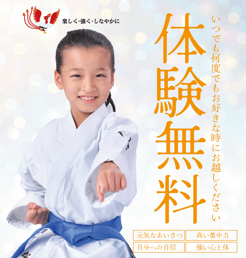 大阪市住吉区、浪速高校徒歩1分のフェニックス空手クラブの体験は無料です。いつでも・何度でも・お好きな時にお越しください。
