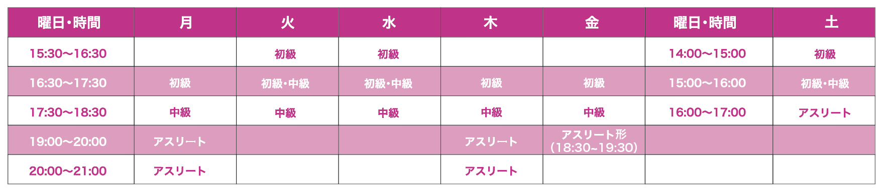 月曜日から土曜日まで毎日あるクラスの中から、自分に合うクラスを自由に選択できます。